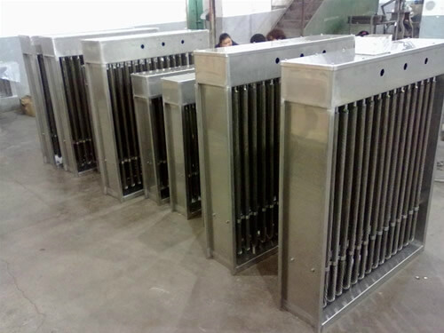 主要用于風(fēng)道中的空氣加熱,規(guī)格分為低溫、中溫、高溫三種形式,在結(jié)構(gòu)上的共同之處是采用鋼板支撐電熱管以減少電熱管的振動,接線盒中都裝有超溫控制裝置。